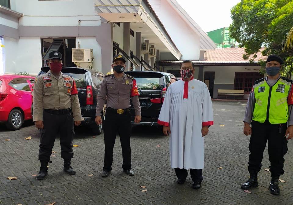 Seputarperak.com- Pengamanan kebaktian dilakukan personil Polsek Krembangan, Polres Pelabuhan Tanjung Perak di Gereja HKBP Jalan Tanjung Sadari, Minggu pagi, 2 Agustus 2020.