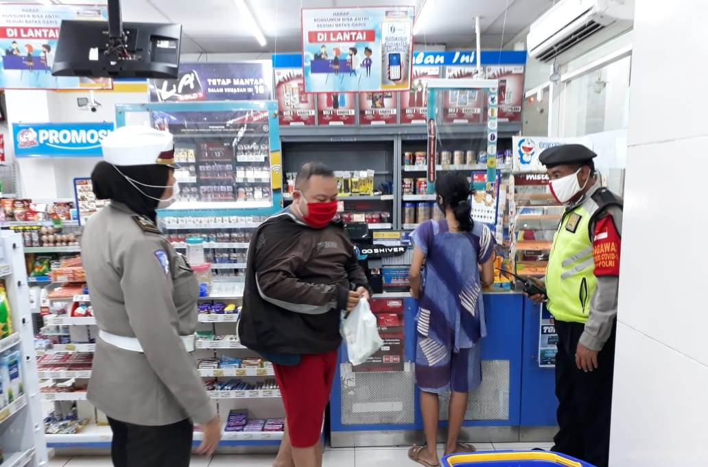 Seputarperak.com- Personil Polsek Pabean Cantikan, Polres Pelabuhan Tanjung Perak melakukan patroli di mini market Indomart, Jalan Waspada, Minggu malam, 2 Agustus 2020.