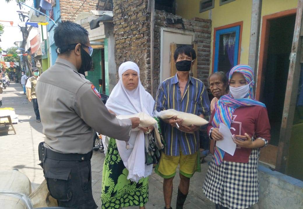 Seputarperak.com- Panit Binmas Polsek Krembangan, Polres Pelabuhan Tanjung Perak, Ipda Eko Mustaghfirin, membagikan Sembako berupa beras, gratis kepada warga RT 20 RW 05 gang Lasem Baru, Kelurahan Dupak, Kamis siang, 6 Agustus 2020.