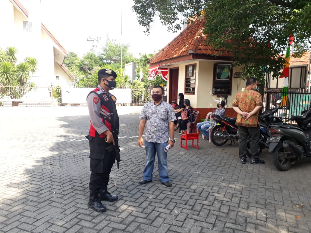 Seputarperak.com- Pengamanan kebaktian dilakukan personil Satsabhara Polres Pelabuhan Tanjung Perak di Gereja Santo Mikael, Jalan Tanjung Sadari, Minggu pagi, 16 Agustus 2020.