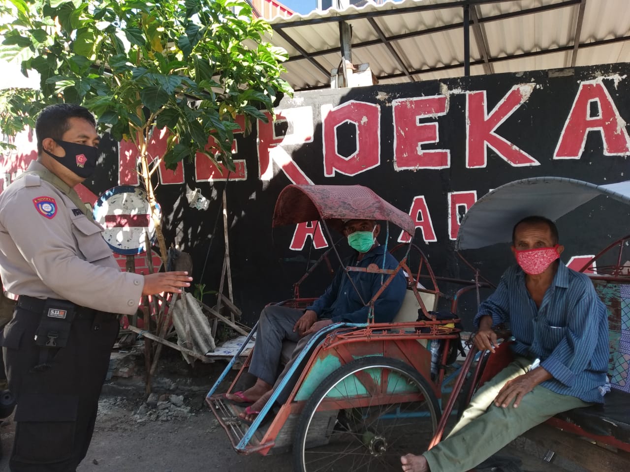 Seputarperak.com- Sosialisasi dan himbauan 3M (Mencuci Tangan, Memakai Masker dan Menjaga Jarak) disampaikan Bripka Victor Sumbodo, Babinkamtibmas Ujung, Polsek Semampir, Polres Pelabuhan Tanjung Perak kepada para penarik becak yang mangkal di Jalan Hangtuah, Jumat, 21 Agustus 2020.