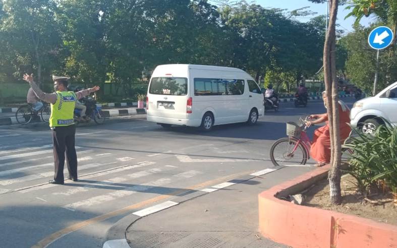 Seputarperak.com- Pengaturan lalu lintas pagi dilakukan personil Unit Lantas Polsek Kenjeran, Polres Pelabuhan Tanjung Perak di Uturn SMAN 19, Jalan Kedung Cowek, Kamis, 27 Agustus 2020.