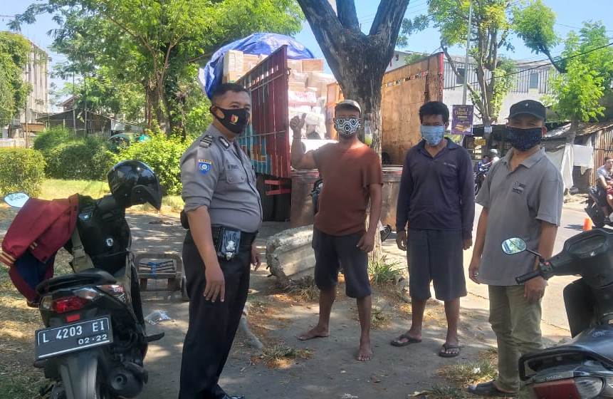 Seputarperak.com- Himbauan masker disampaikan Aiptu Heru Winarto, Babinkamtibmas Perak Utara, Polsek Pabean Cantikan, Polres Pelabuhan Tanjung Perak kepada para kuli ekspedisi di Jalan Kalimas Timur, Kamis pagi, 27 Agustus 2020.