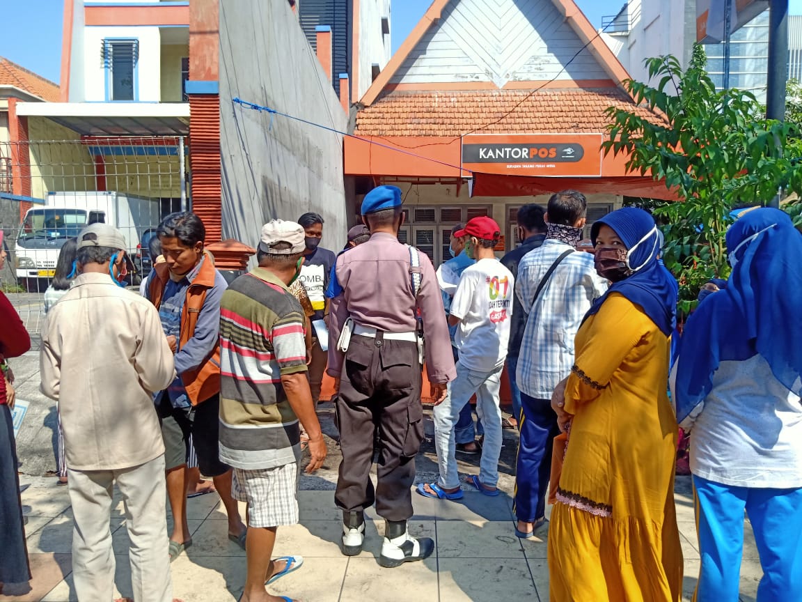 Seputarperak.com- Personil Propam Polres Pelabuhan Tanjung Perak ikut melakukan pengamanan pengambilan bantuan sosial tunai (BST) di Kantor Pos Jalan Perak Barat, Minggu pagi, 30 Agustus 2020.