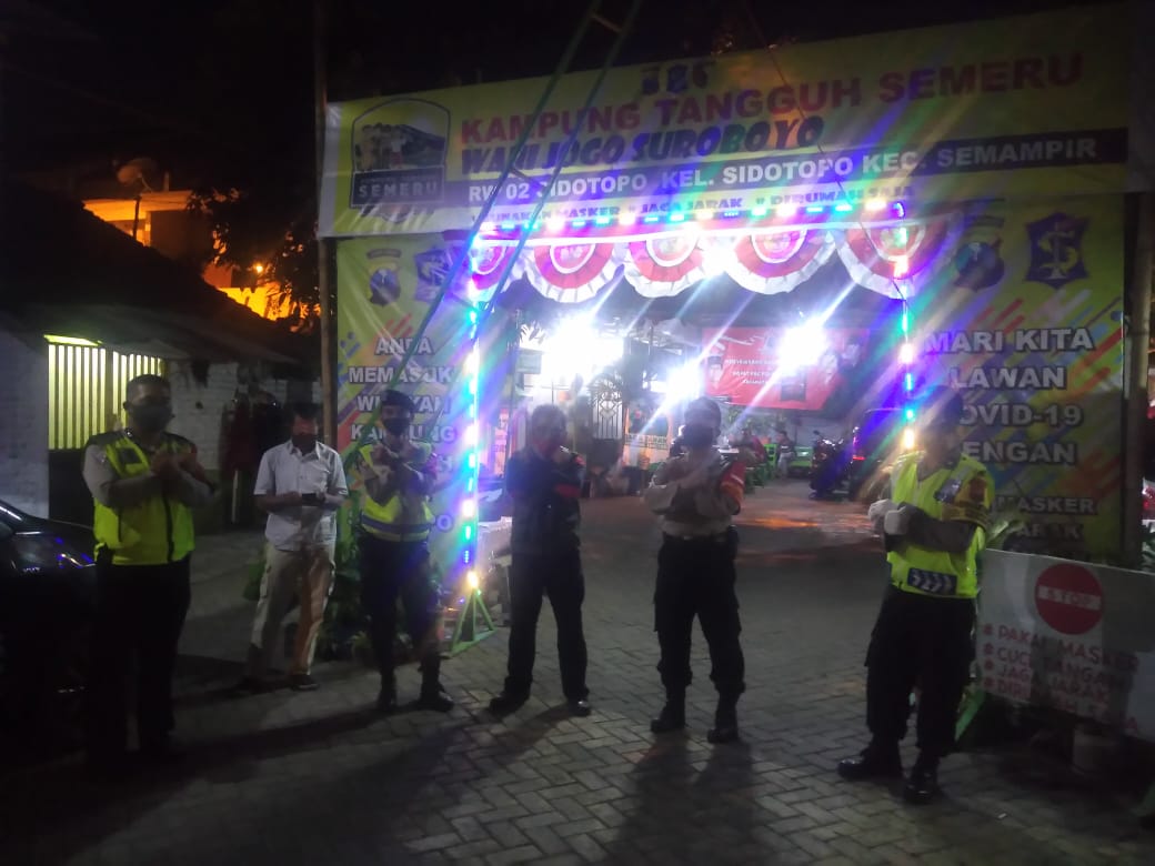 Seputarperak.com- Patroli dilakukan personil Polsek Semampir, Polres Pelabuhan Tanjung Perak di pemukiman Kampung Tangguh Semeru RW 02 Jalan Sidotopo Lor, Kelurahan Sidotopo, Minggu malam, 30 Agustus 2020.