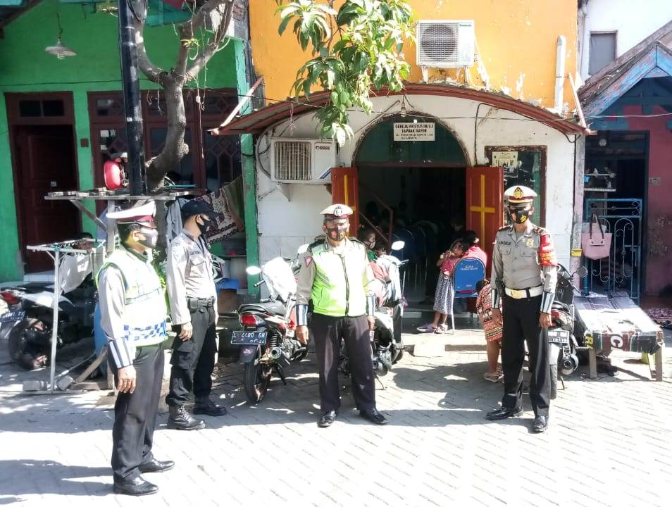 Seputarperak.com- Pengamanan dilakukan personil Polsek Asemrowo, Polres Pelabuhan Tanjung Perak di Gereja Kristus Injil (GKI) Siloam, Jalan Simorejosari, Minggu pagi, 6 September 2020.