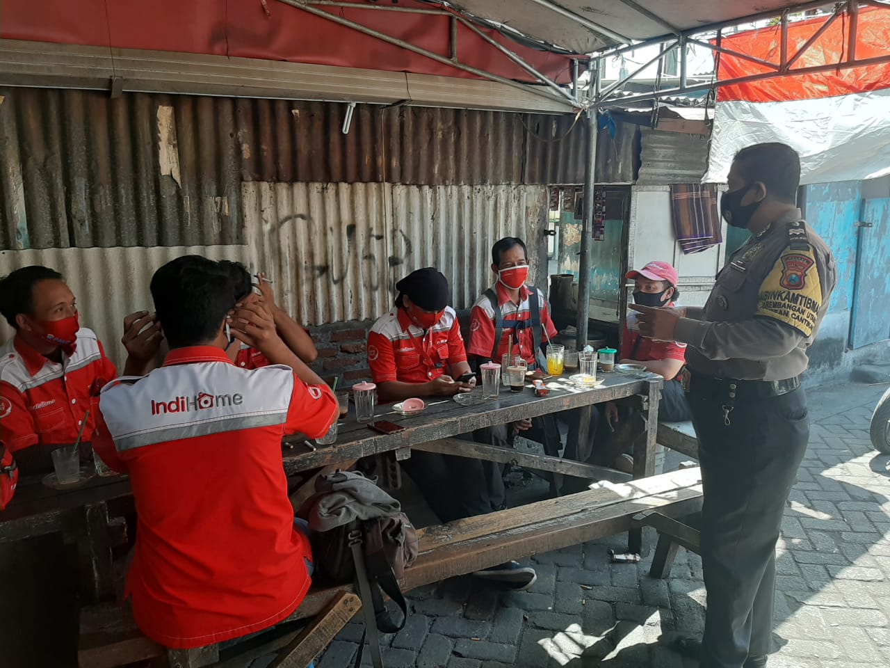 Seputarperak.com- Himbauan 3M (Memakai Masker, Mencuci Tangan dan Menjaga Jarak) disampaikan Aiptu M Yasin, Babinkamtibmas Krembangan Utara, Polsek Pabean Cantikan, Polres Pelabuhan Tanjung Perak kepada pengunjung warung di Jalan Sampoerna, Senin siang, 7 September 2020.