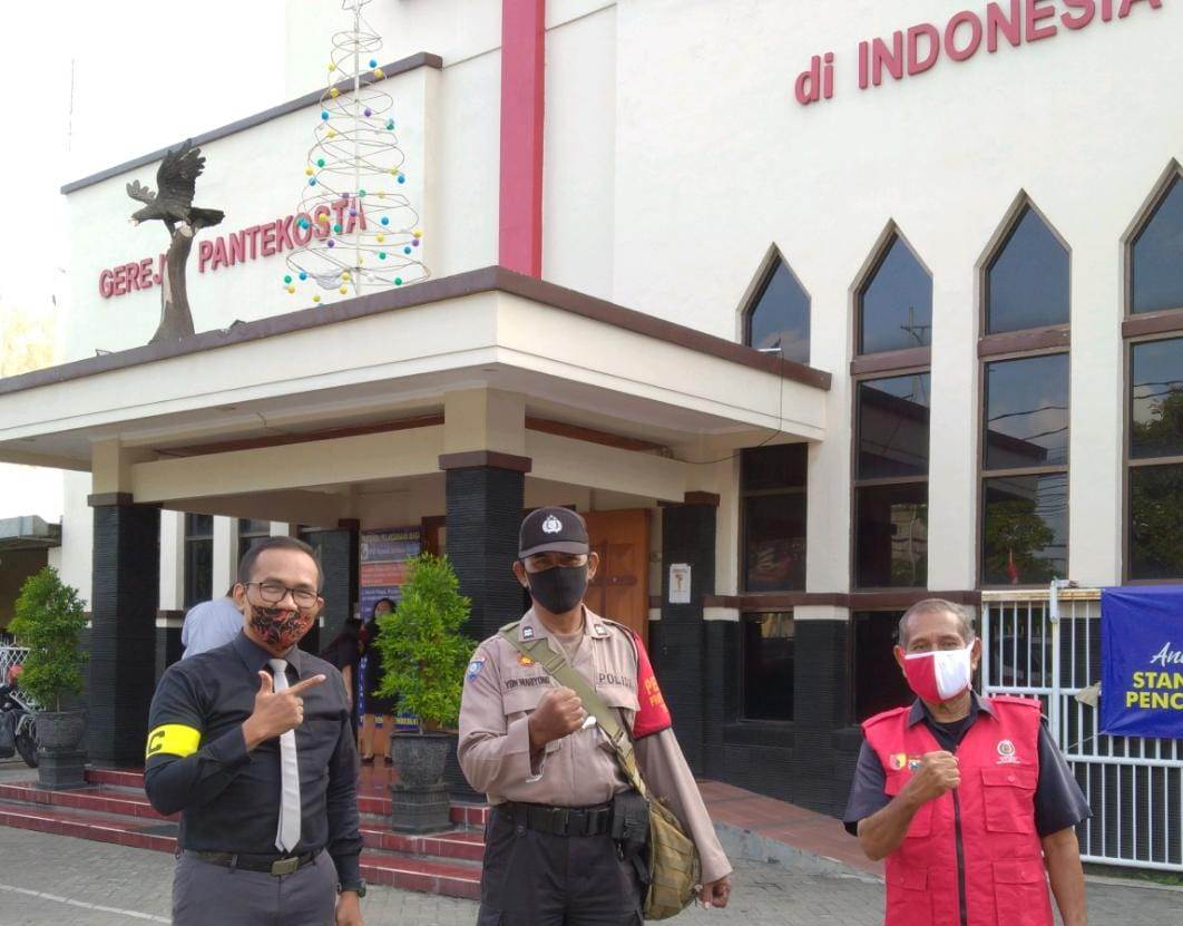 Seputarperak.com- Pengamanan kebaktian dilakukan Aiptu Marijono, Babinkamtibmas Perak Timur, Polsek Pabean Cantikan, Polres Pelabuhan Tanjung Perak di Gereja Pantekosta, Jalan Rajawali, Minggu pagi, 13 September 2020.