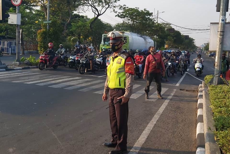 Salah satunya seperti yang dilakukan personil Unit Lantas Polsek Krembangan di perempatan Mbah Ratu, Jalan Demak, Selasa pagi, 22 September 2020.