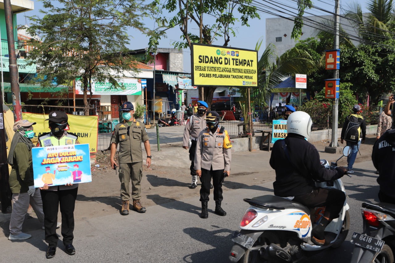 Seputarperak.com- Kapolres Pelabuhan Tanjung Perak, AKBP Ganis Setyaningrum, S.Si, MH memimpin operasi yustisi protokol kesehatan yang digelar Rabu pagi, 23 September 2020 di Jalan Tambak Mayor.
