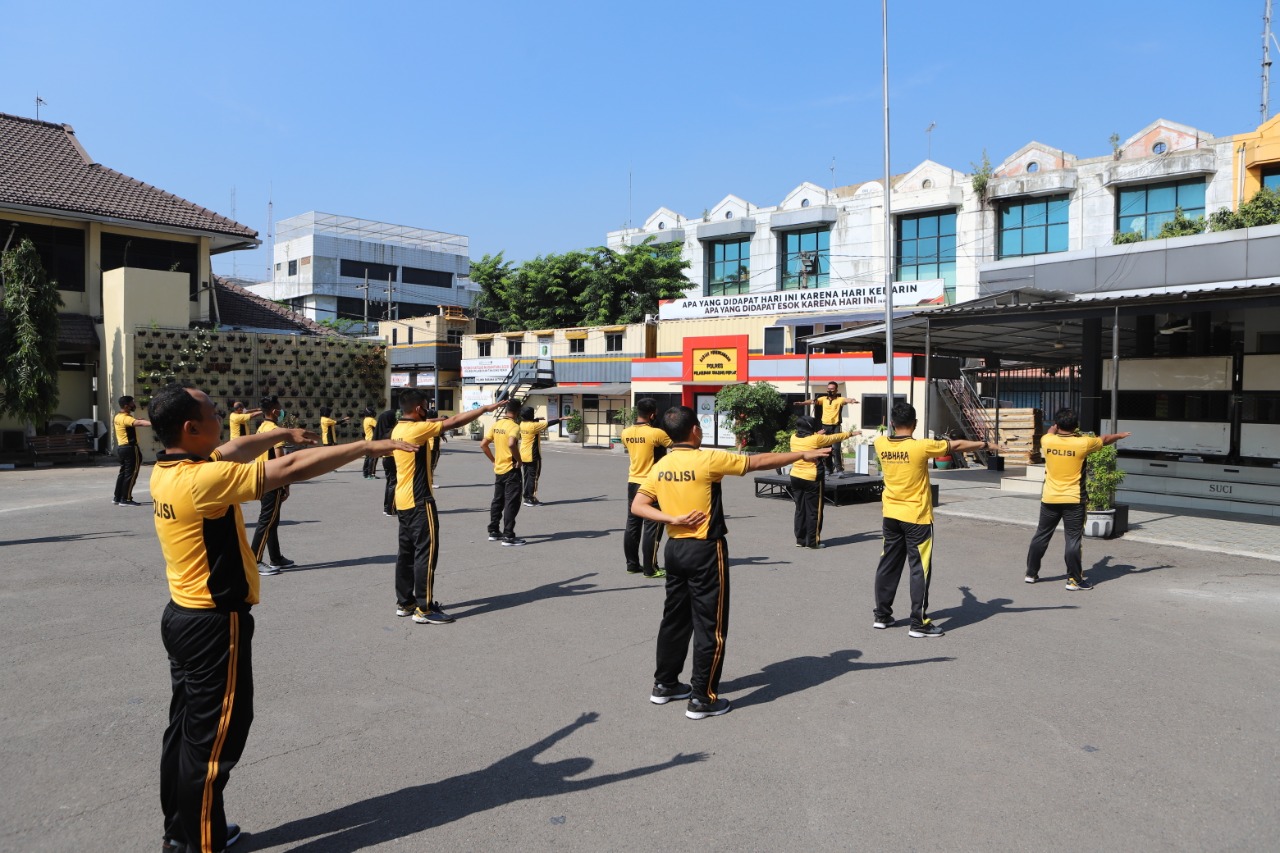 Puluhan personil berkumpul melaksanakan olahraga pagi yang dipimpin oleh Kabag Ren AKP Budi Cahyono, S.Sos.
