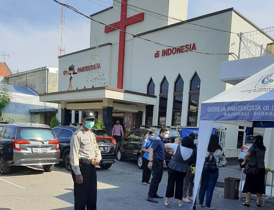 Seputarperak.com- Pengamanan kebaktian dilakukan Aiptu Marijono, Babinkamtibmas Perak Timur, Polsek Pabean Cantikan, Polres Pelabuhan Tanjung Perak di Gereja Pantekosta, Jalan Rajawali, Minggu pagi, 25 Oktober 2020.