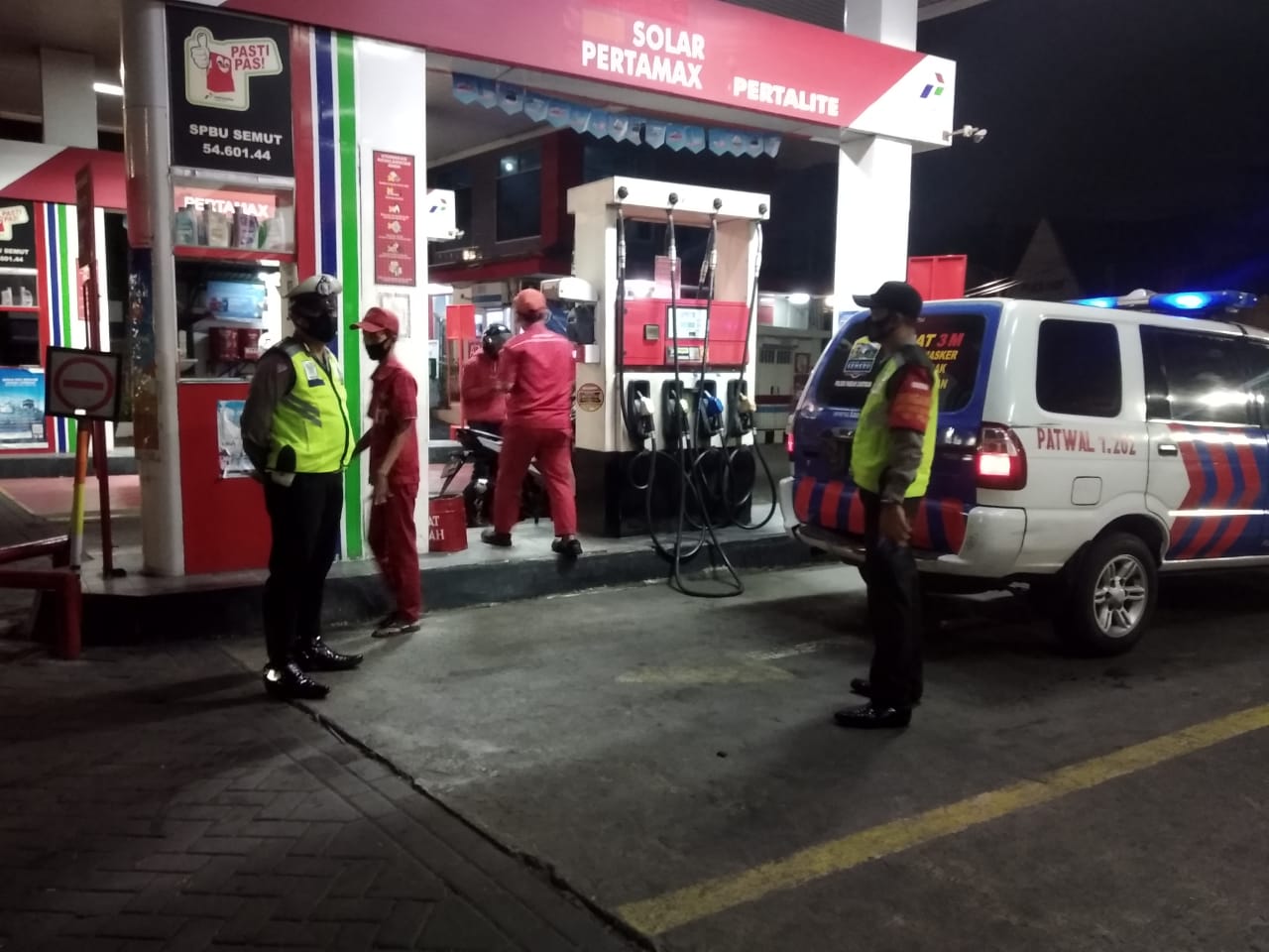 Seputarperak.com- Patroli malam dilakukan personil Polsek Pabean Cantikan, Polres Pelabuhan Tanjung Perak di SPBU Jalan Stasiun Kota, Selasa, 27 Oktober 2020.