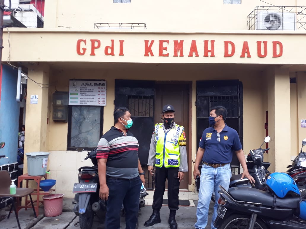Seputarperak.com- Pengamanan kebaktian dilakukan personil Polsek Semampir, Polres Pelabuhan Tanjung Perak di Gereja GPID Kemah Daud, Jalan Jatisrono Barat, Minggu pagi, 1 Nopember 2020.