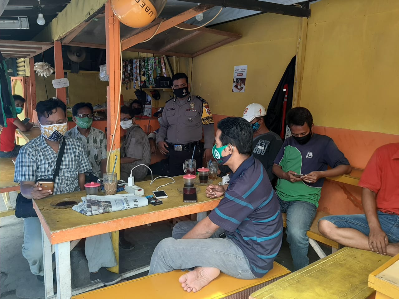 Seputarperak.com- Himbauan 3M (Memakai Masker, Mencuci Tangan Sesering Mungkin dan Menjaga Jarak Sosial) disampaikan Aiptu M Yasin, Babinkamtibmas Krembangan Utara, Polsek Pabean Cantikan, Polres Pelabuhan Tanjung Perak kepada pengunjung warung di Jalan Kebalen Wetan.