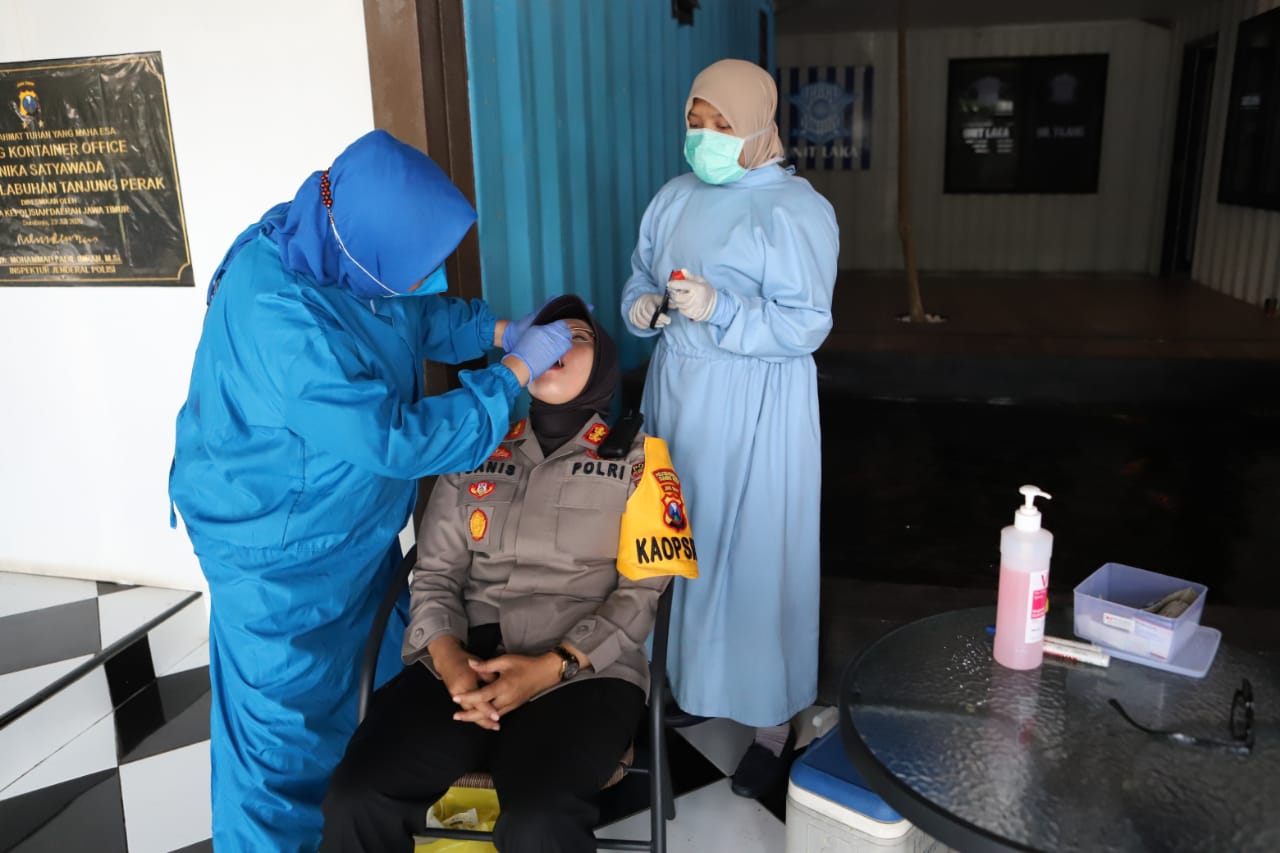 Seputarperak.com- Polres Pelabuhan Tanjung Perak menggelar swab tes untuk seluruh personil Polri, ASN dan PHL, Rabu pagi, 2 Desember 2020. Kegiatan ini dilaksanakan di gedung container office guna mencegah penyebaran Covid-19.