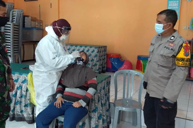 Seputarperak.com- Pengamanan dilakukan Aiptu Wiji Supriyadi, Babinkamtibmas Perak Barat, Polsek Krembangan, Polres Pelabuhan Tanjung Perak di acara swab tes yang digelar di Kampung Tangguh Semeruh (KTS) RW 06, Kelurahan Perak Barat, Senin pagi, 28 Desember 2020.