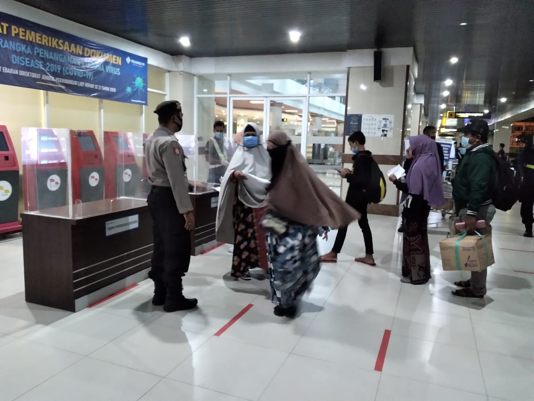 Bagi yang hendak mudik atau balik, mereka dilakukan pengecekan suhu badan dan penyemprotan diinfektan.