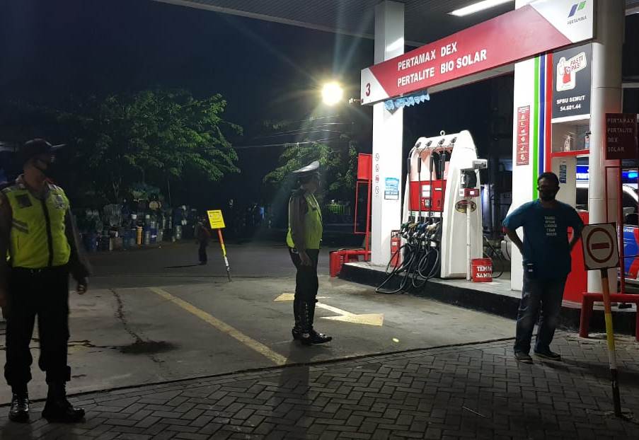 Seputarperak.com- Patroli dilakukan personil Polsek Pabean Cantikan, Polres Pelabuhan Tanjung Perak di SPBU Jalan Stasiun Kota, Selasa malam, 19 Januari 2021.