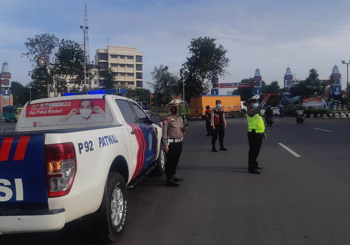 Seputarperak.com- Pengaturan lalu lintas pagi dilakukan personil Satlantas Polres Pelabuhan Tanjung Perak di Jalan Perak Timur, Senin, 25 Januari 2021.
