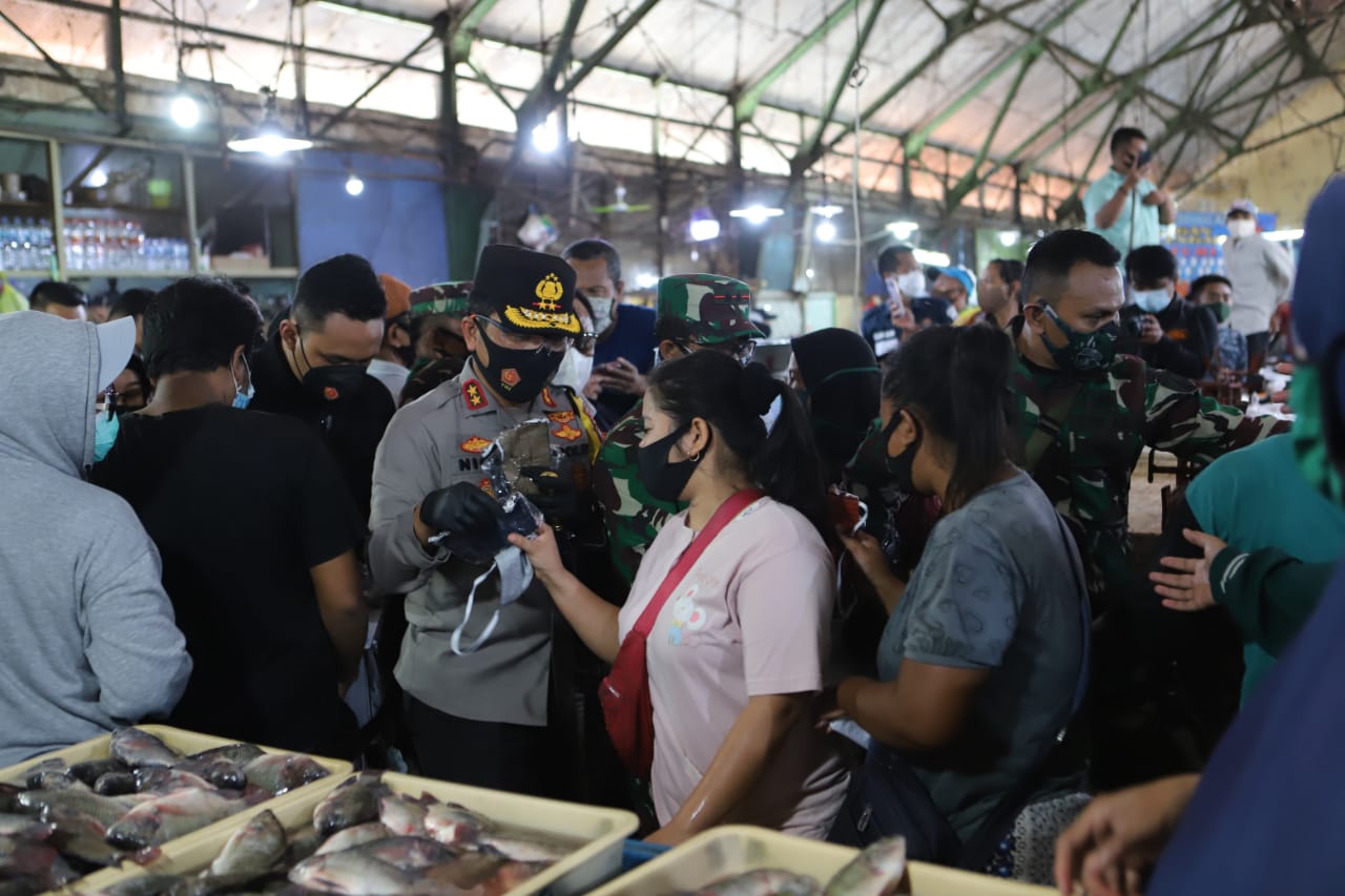 Kedatangan rombongan Kapolda dan Pangdam ini dilakukan dalam rangka membagikan paket masker dan hand sanitizer kepada para pedagang dan pengunjung pasar.