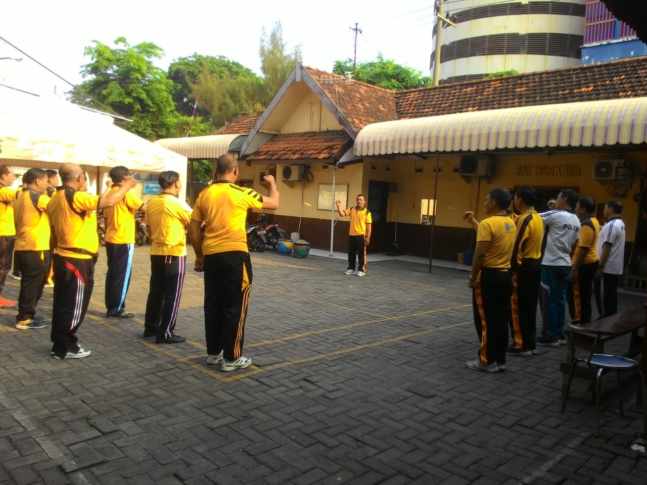 Seputarperak.com- Polsek Pabean Cantikan, Polres Pelabuhan Tanjung Perak menggelar olahraga pagi di lapangan Mapolsek, Sabtu, 1 September 2018.