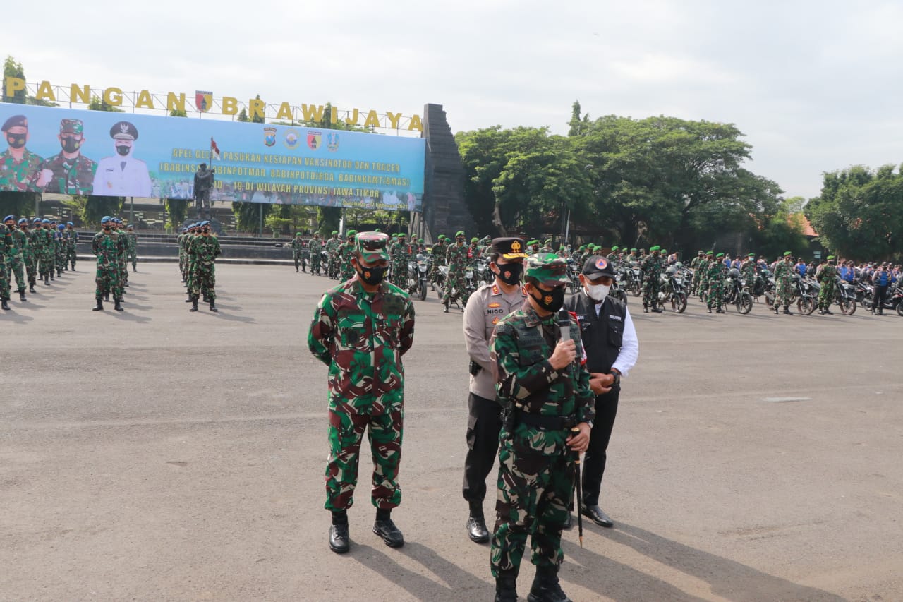 Seputarperak.com- Pangdam V Brawijaya, Mayjen TNI Suharyanto, didampingi oleh Kaskoarmada II, Laksma TNI Dafit Santoso, Kapolda Jawa Timur, Irjen Pol Nico Afinta dan Sekdaprov Jatim, Heru Tjahjono, memimpin apel Gelar Kesiapan Tenaga Vaksinator dan Tracer Covid-19 di Lapangan Makodam V Brawijaya, Surabaya, Jawa Timur, Rabu (10/2/2021).