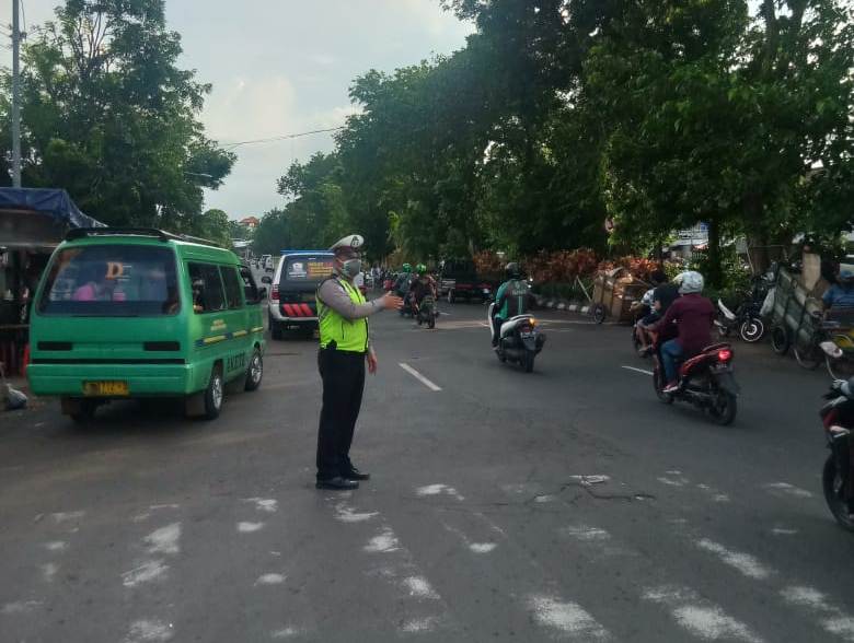 Seputarperak.com- Pengaturan lalu lintas dilakukan personil Unit Lantas Polsek Semampir, Polres Pelabuhan Tanjung Perak di Jalan Karang Tembok, Sabtu sore, 13 Pebruari 2021.