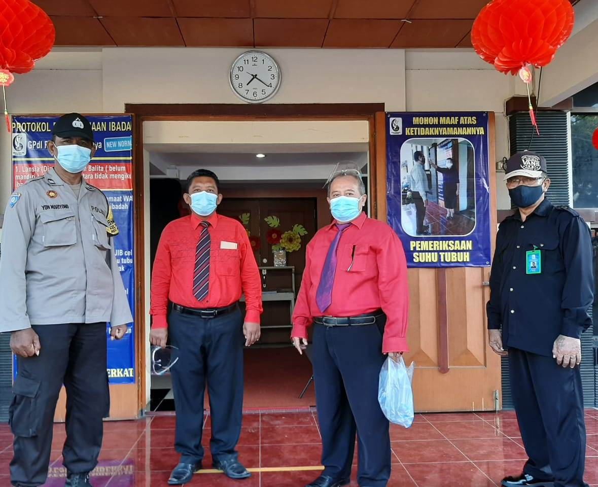 Seputarperak.com- Pengamanan kebaktian dilakukan Aiptu Marijono, Babinkamtibmas Perak Timur, Polsek Pabean Cantikan, Polres Pelabuhan Tanjung Perak di Gereja Pantekosta, Jalan Rajawali, Minggu pagi, 14 Pebruari 2021.