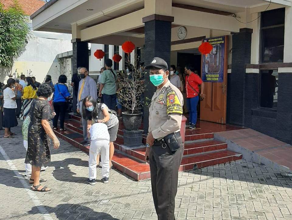 Seputarperak.com- Pengamanan ibadah rutin di Gereja Pantekosta, Jalan Rajawali dilaksanakan Aiptu Marijono, Babinkamtibmas Perak Timur, Polsek Pabean Cantikan, Polres Pelabuhan Tanjung Perak, Minggu pagi, 21 Pebruari 2021.