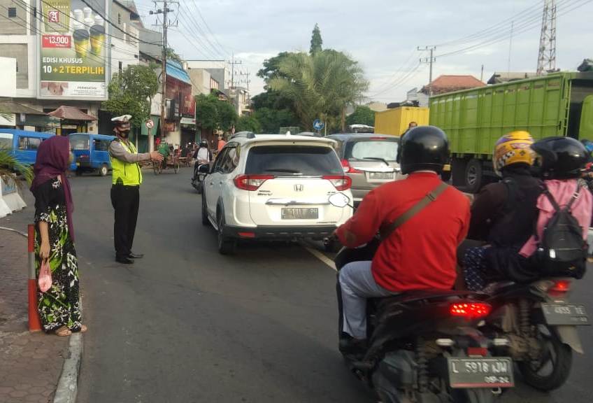 Seputarperak.com- Pengaturan lalu lintas dilakukan personil Unit Lantas Polsek Semampir di Jalan Karang Tembok, Selasa pagi, 23 Pebruari 2021.
