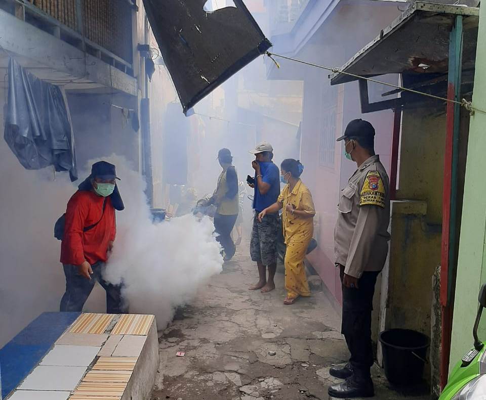 Kegiatan fogging ini dilakukan Aiptu Marijono, Babinkamtibmas Perak Timur, Polsek Pabean Cantikan, Polres Pelabuhan Tanjung Perak bersama petugas kelurahan dan Puskesmas.