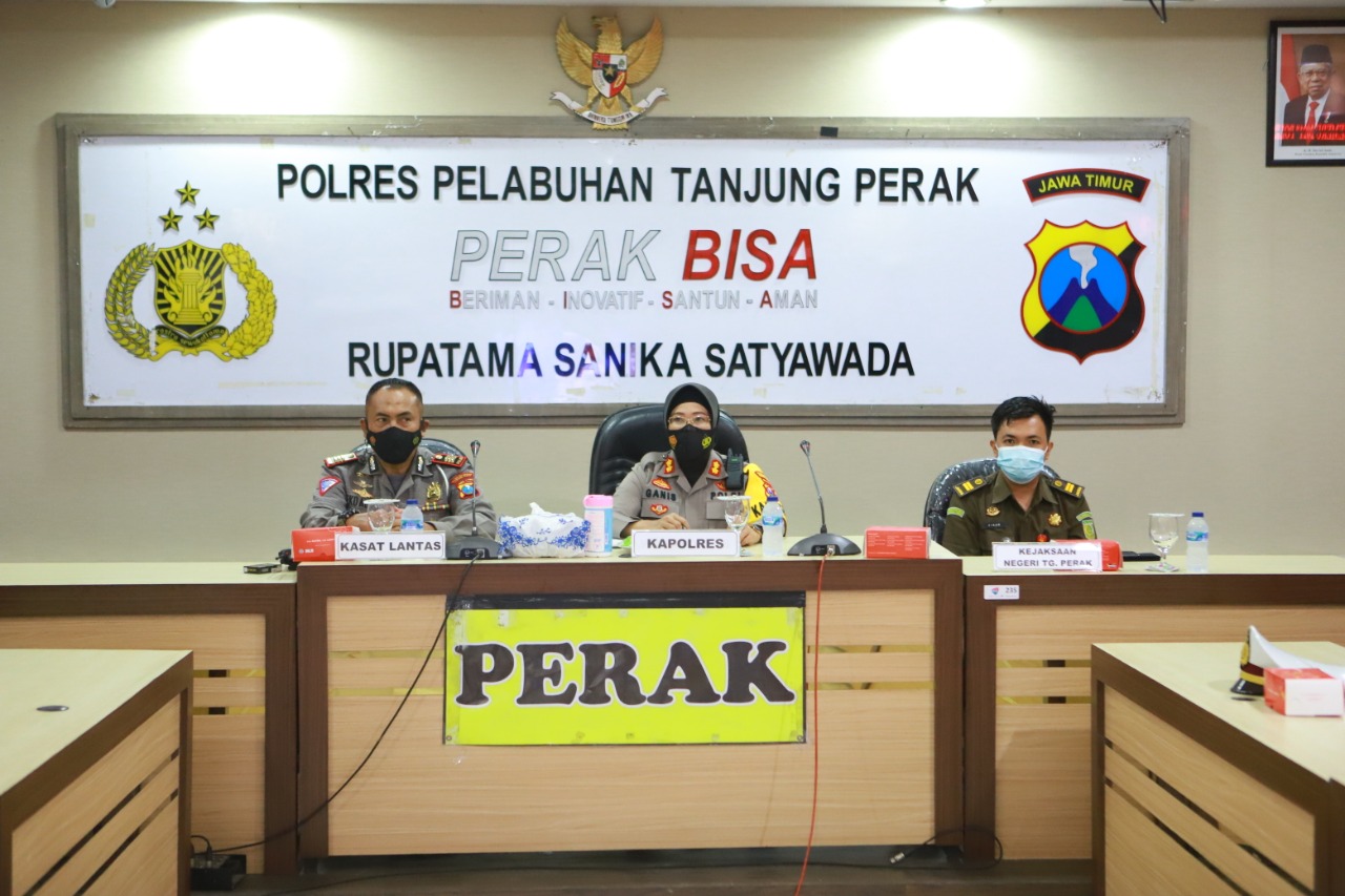 Seputarperak.com- Kapolres Pelabuhan Tanjung Perak, AKBP Ganis Setyaningrum, S.Si, MH memimpin pelaksanaan zoom meeting bersama Kapolri dan Kakorlantas di Ruang Rupatama Sanika Satyawada Mako, Selasa, 23 Maret 2021.