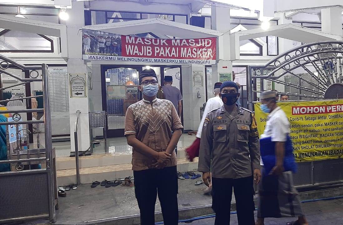 Seputarperak.com- Pengamanan kegiatan sholat tarawih dilakukan Aiptu Wiji Supriyadi, Babinkamtibmas Perak Barat, Polsek Krembangan,Polres Pelabuhan Tanjung Perak di Masjid Miftahul Khoir, Jalan Ikan Dorang, Kamis malam, 15 April 2021.