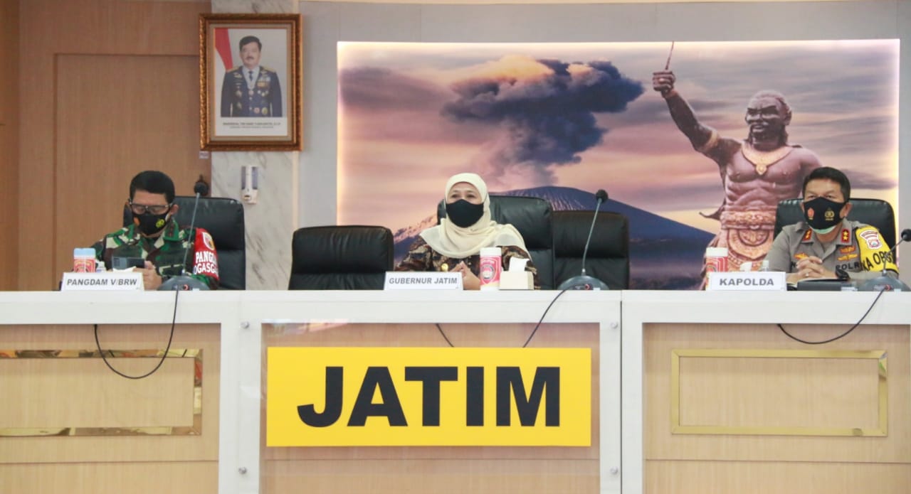 Seputarperak.com- Forkopimda Jawa Timur, Gubernur Jatim, Pangdam V Brawijaya dan Kapolda Jawa Timur, Rabu (21/4/2021) siang, melaksanakan Vidcon Rakor Lintas Sektoral Pimpinan Bapak Kapolri Terkait Persiapan Pengamanan Idul Fitri 1442 H. Dimasa Pandemi Covid-19 Tahun 2021, di Gedung Rupatama, Mapolda Jawa Timur.
