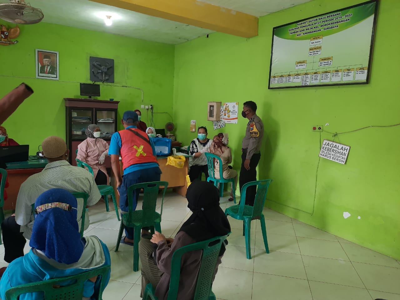 Seputarperak.com- Pengamanan vaksinasi Covid-19 dilakukan Aiptu Mulyadi Herwoyo, Babinkamtibmas Morokrembangan, Polsek Krembangan, Polres Pelabuhan Tanjung Perak di Balai RT 07 RW 06 Tambak Asri, Sabtu pagi, 24 April 2021.