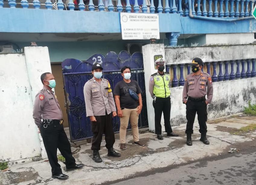 Seputarperak.com- Pengamanan kebaktian dilakukan personil Polsek Asemrowo, Polres Pelabuhan Tanjung Perak di Gereja Mess Panen Raya, Jalan Asem Raya, Minggu pagi, 25 April 2021.