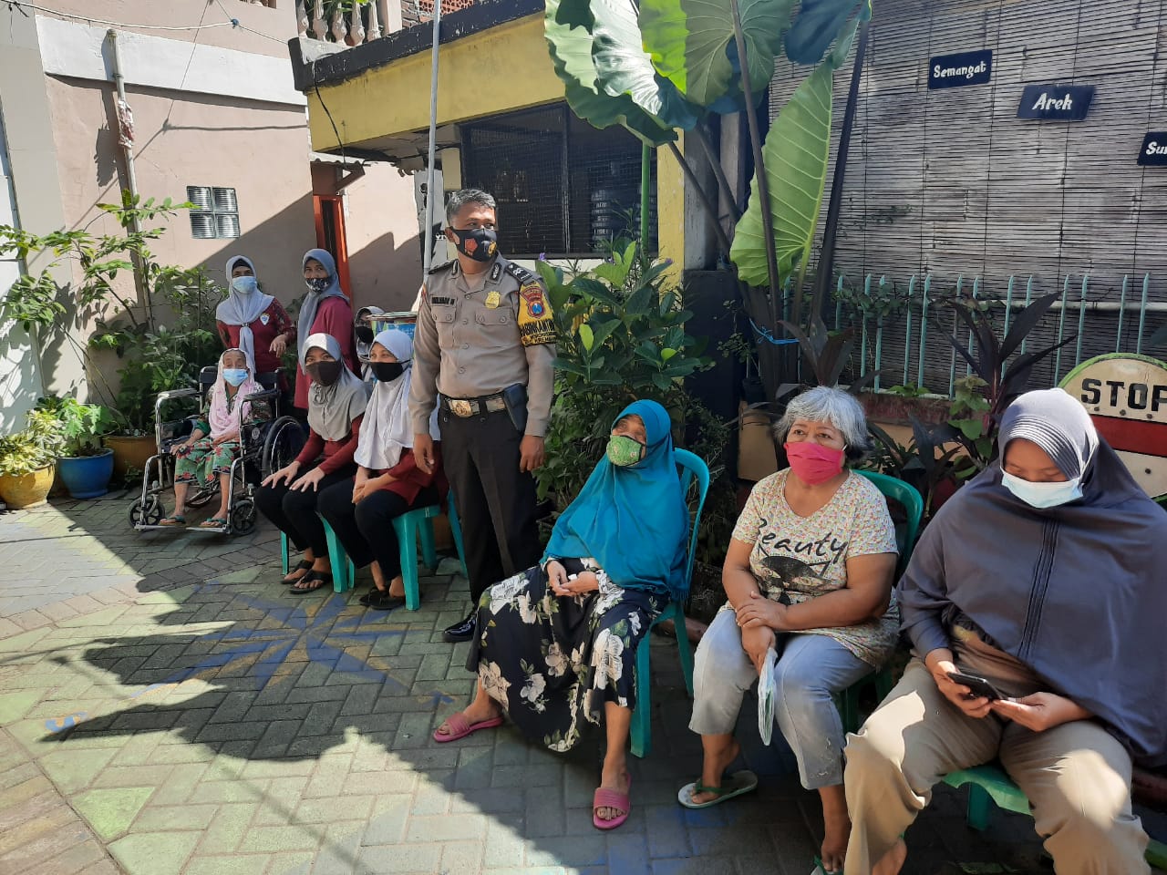Seputarperak.com- Pengamanan vaksinasi Covid-19 dilakukan Aiptu Mulyadi Herwoyo, Babinkamtibmas Morokrembangan, Polsek Krembangan, Polres Pelabuhan Tanjung Perak di Balai RT 02 RW 05 Gadukan Utara, Senin pagi, 26 April 2021.