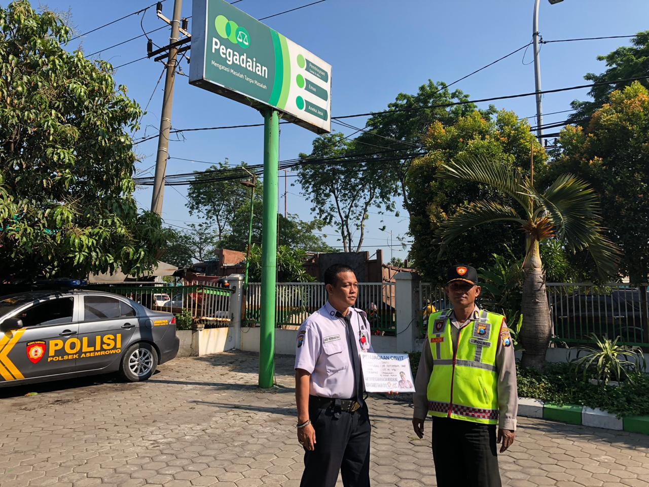 Personil Unit Sabhara Polsek Asemrowo, saat itu menemui petugas sekuriti kantor Pegadaian, untuk menyampaikan beberapa pesan kamtibmas.