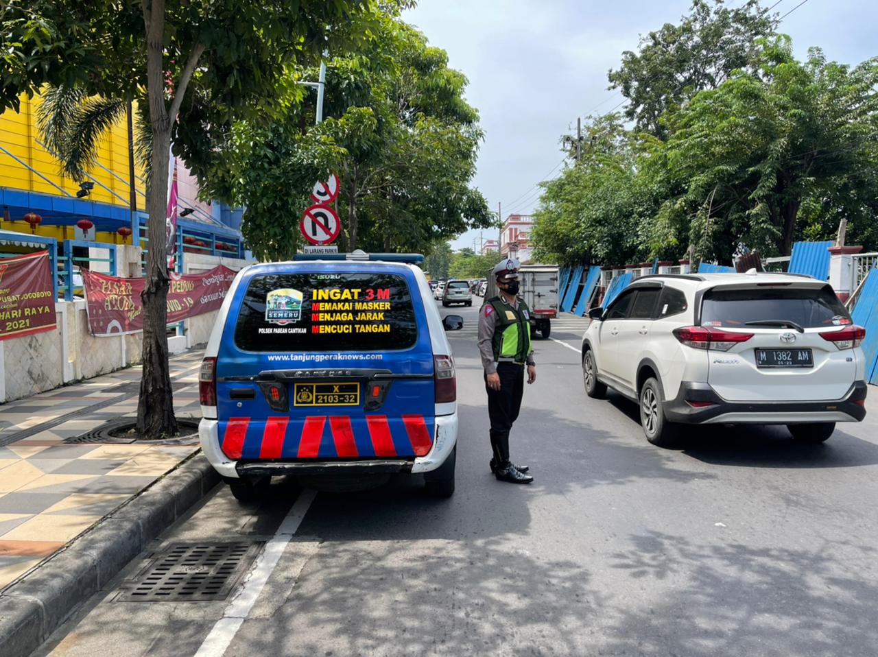 Seputarperak.com- Pengaturan lalu lintas dilakukan personil Unit Lantas Polsek Pabean Cantikan, Polres Pelabuhan Tanjung Perak di Jalan Stasiun Kota, Kamis sore, 6 Mei 2021.