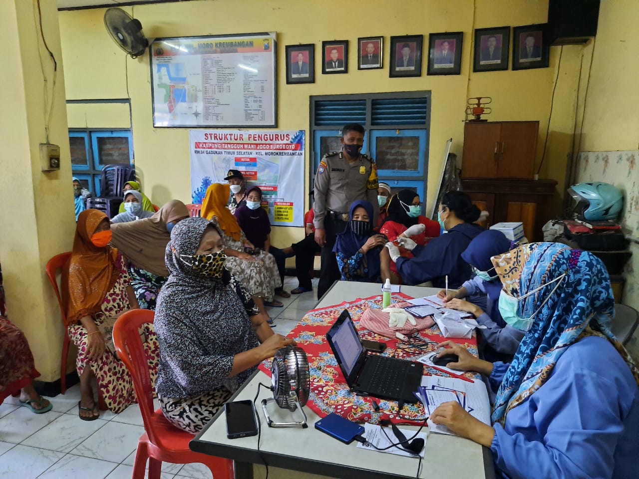 Seputarperak.com- Pengamanan vaksinasi Covid-19 dilakukan Aiptu Mulyadi Herwoyo, Babinkamtibmas Morokrembangan, Polsek Krembangan di RW 04 Gadukan, Sabtu pagi, 8 Mei 2021.
