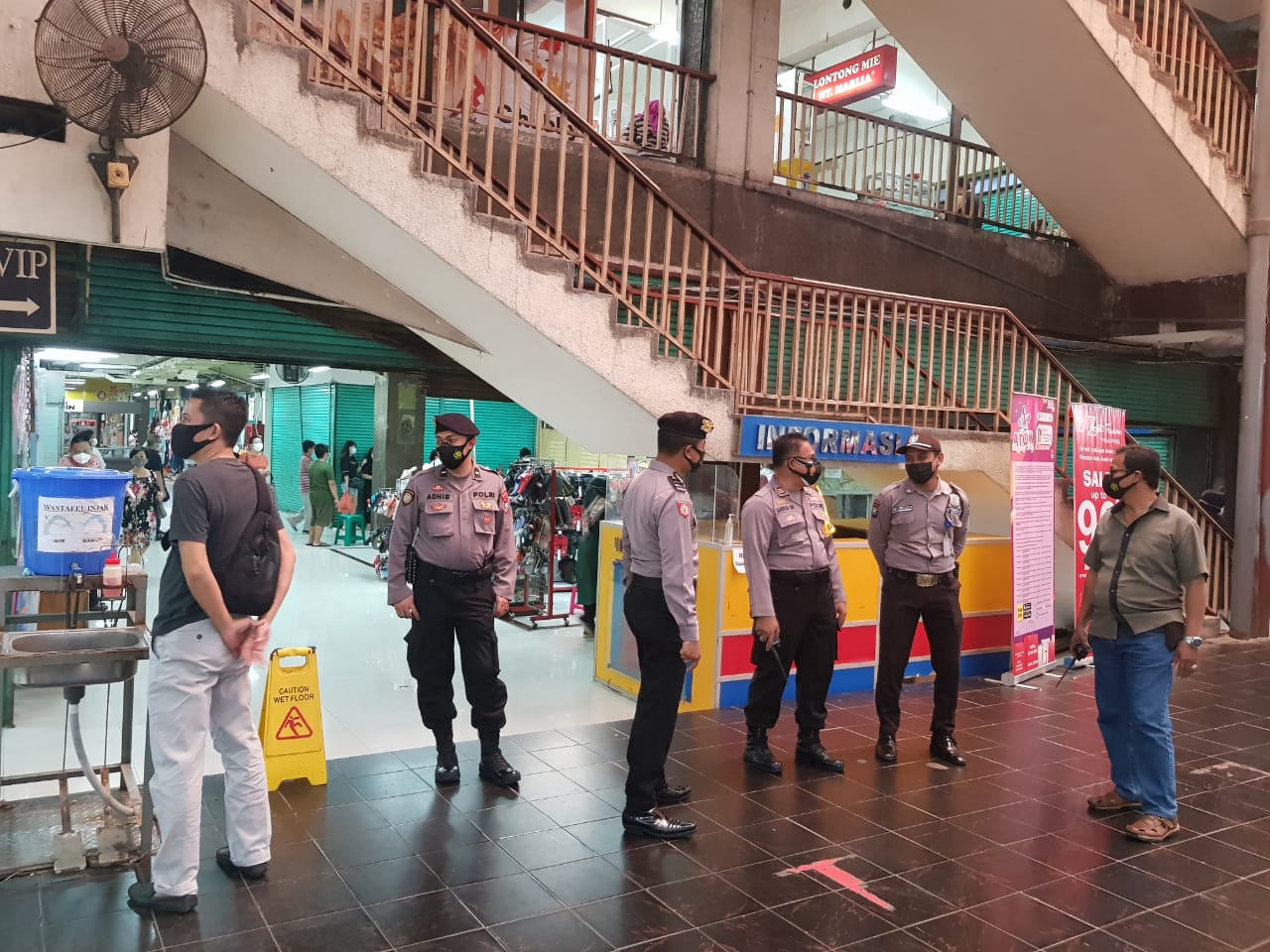 Seputarperak.com- Pemantauan protokol kesehatan (Prokes) dilakukan personil Polsek Pabean Cantikan, Polres Pelabuhan Tanjung Perak di Mall Pasar Atom, Jalan Bunguran, Sabtu, 15 Mei 2021.