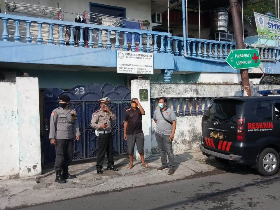 Seputarperak.com- Pengamanan kebaktian dilakukan personil Polsek Asemrowo, Polres Pelabuhan Tanjung Perak di Gereja Mess Panen Raya, Jalan Asem Raya, Minggu pagi, 16 Mei 2021.