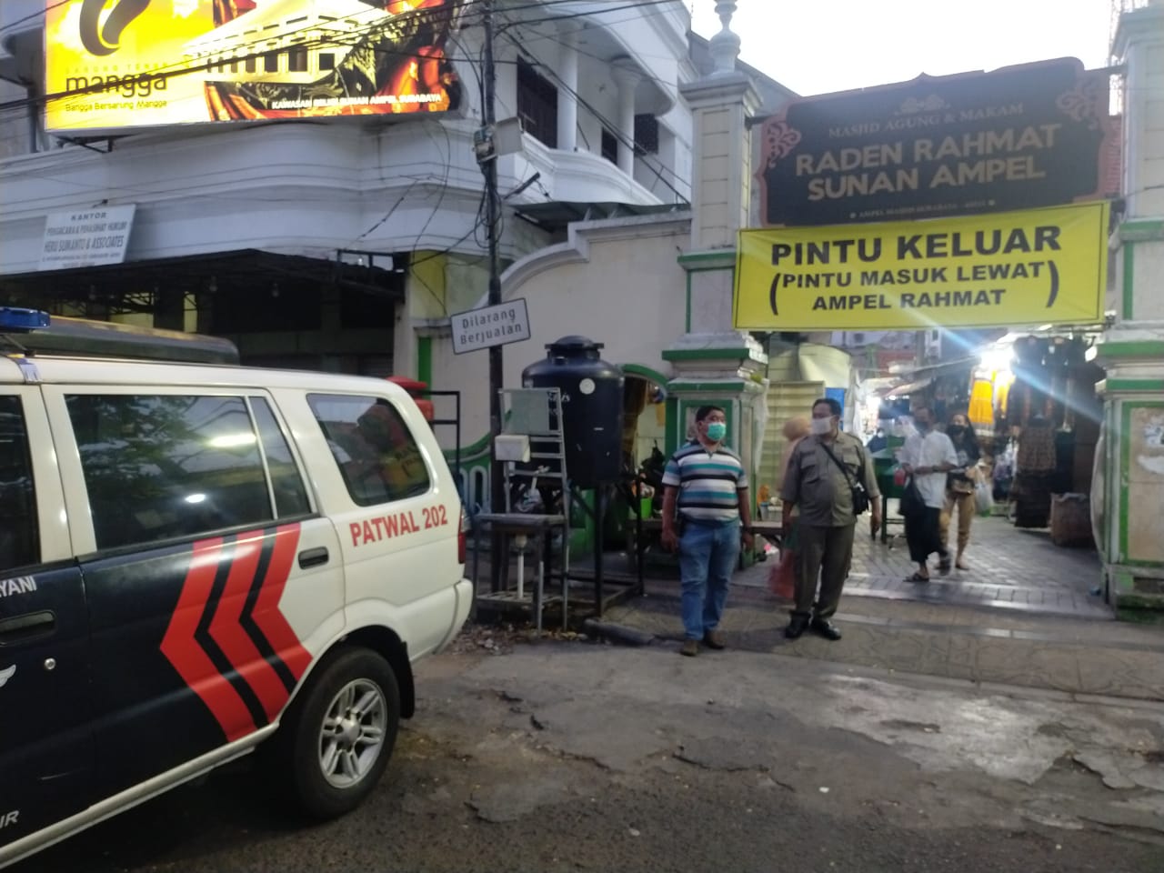 Seputarperak.com- Pemantauan protokol kesehatan masih terus dilakukan personil Polsek Semampir, Polres Pelabuhan Tanjung Perak bersama instansi samping di wisata religi Ampel, Jalan Nyamplungan.