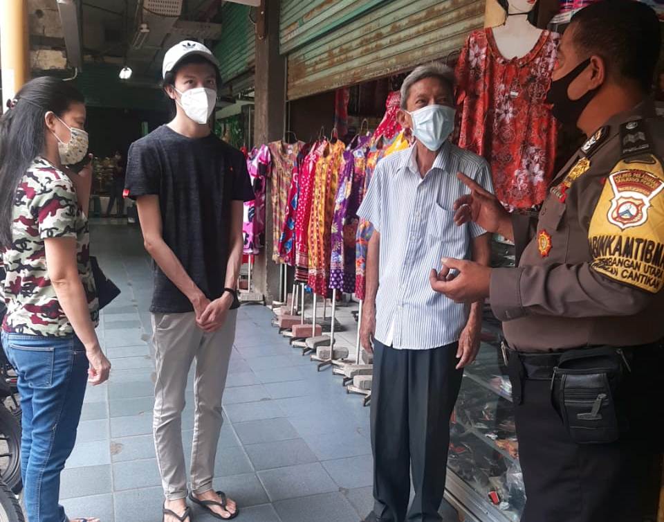 Seputarperak.com- Himbauan patuh protokol kesehatan (Prokes) disampaikan Aiptu M Yasin, Babinkamtibmas Krembangan Utara, Polsek Pabean Cantikan, Polres Pelabuhan Tanjung Perak kepada pengunjung mall Pasar Atom, Selasa pagi, 18 Mei 2021.