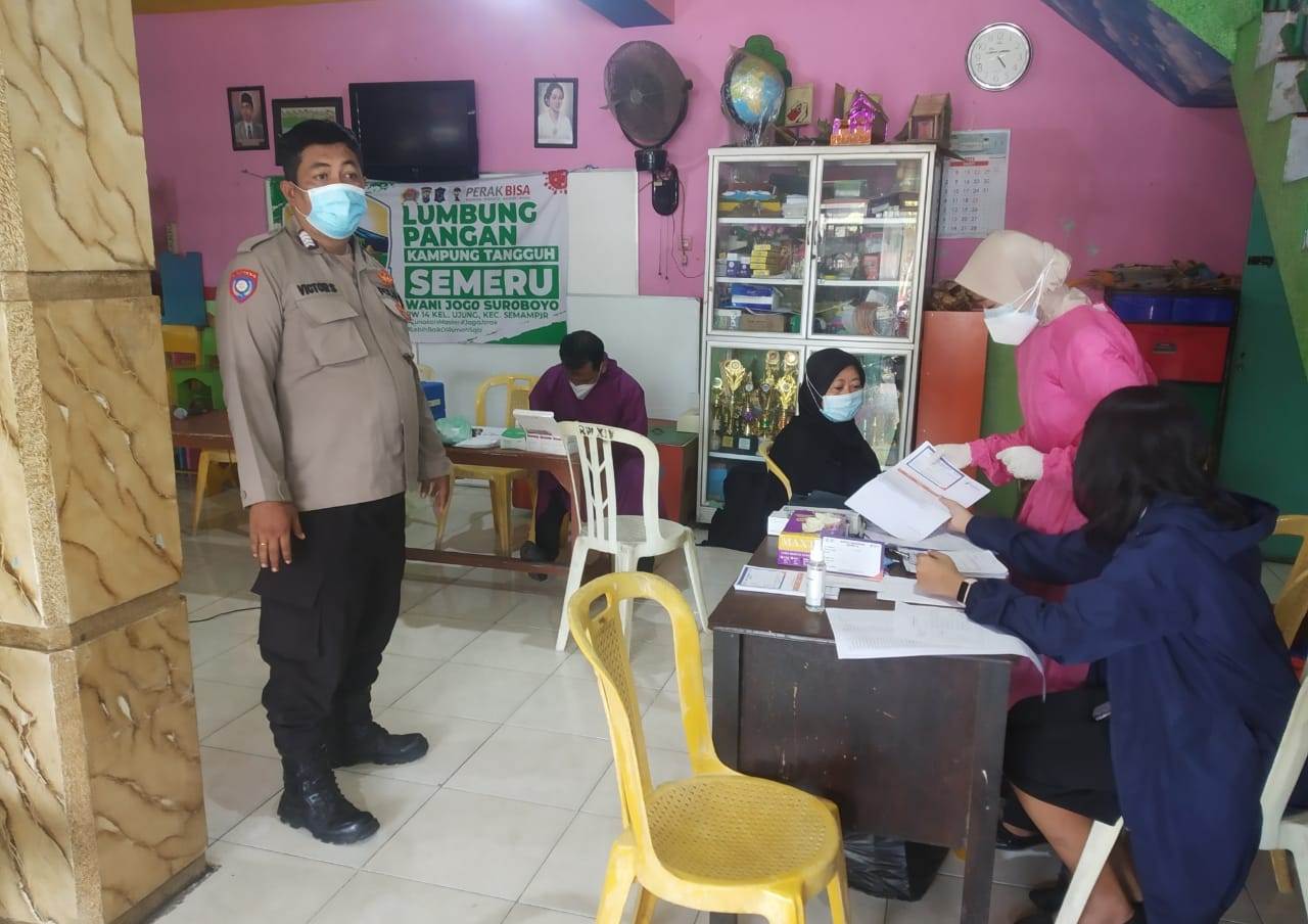 Seputarperak.com- Pengamanan vaksinasi Covid-19 dilakukan Bripka Victor Sumbodo, Babinkamtibmas Ujung, Polsek Semampir, Polres Pelabuhan Tanjung Perak di Balai RW 14 Jatisrono, Rabu pagi, 19 Mei 2021.