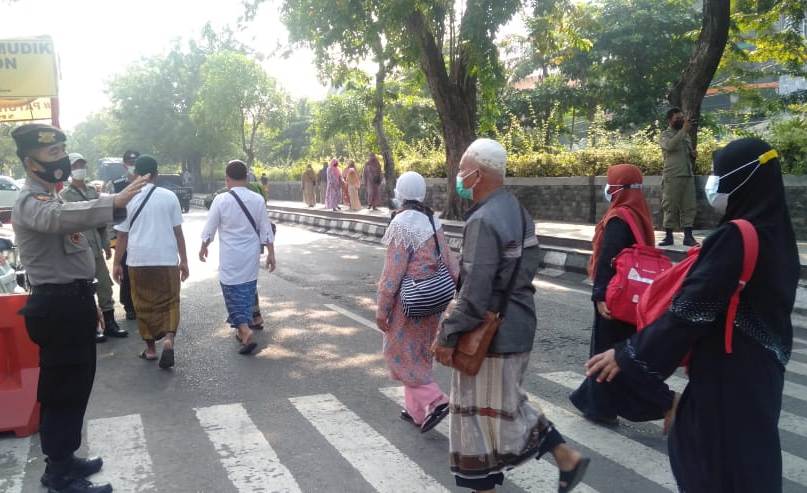 Seputarperak.com- Pengaturan lalu lintas dilakukan personil Polsek Semampir di Jalan Nyamplungan, depan pintu masuk wisata religi Ampel, Sabtu pagi, 22 Mei 2021.