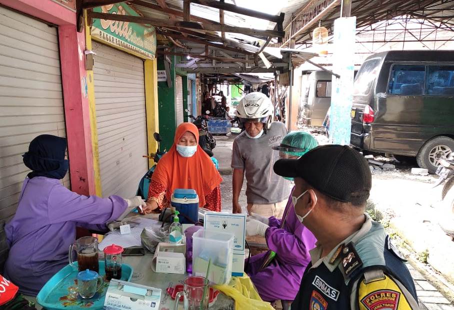 Saat itu pelaksanaan vaksinasi diikuti oleh pedagang Pasar Podomoro yang dilakukan oleh petugas Puskesmas Bulak Banteng.