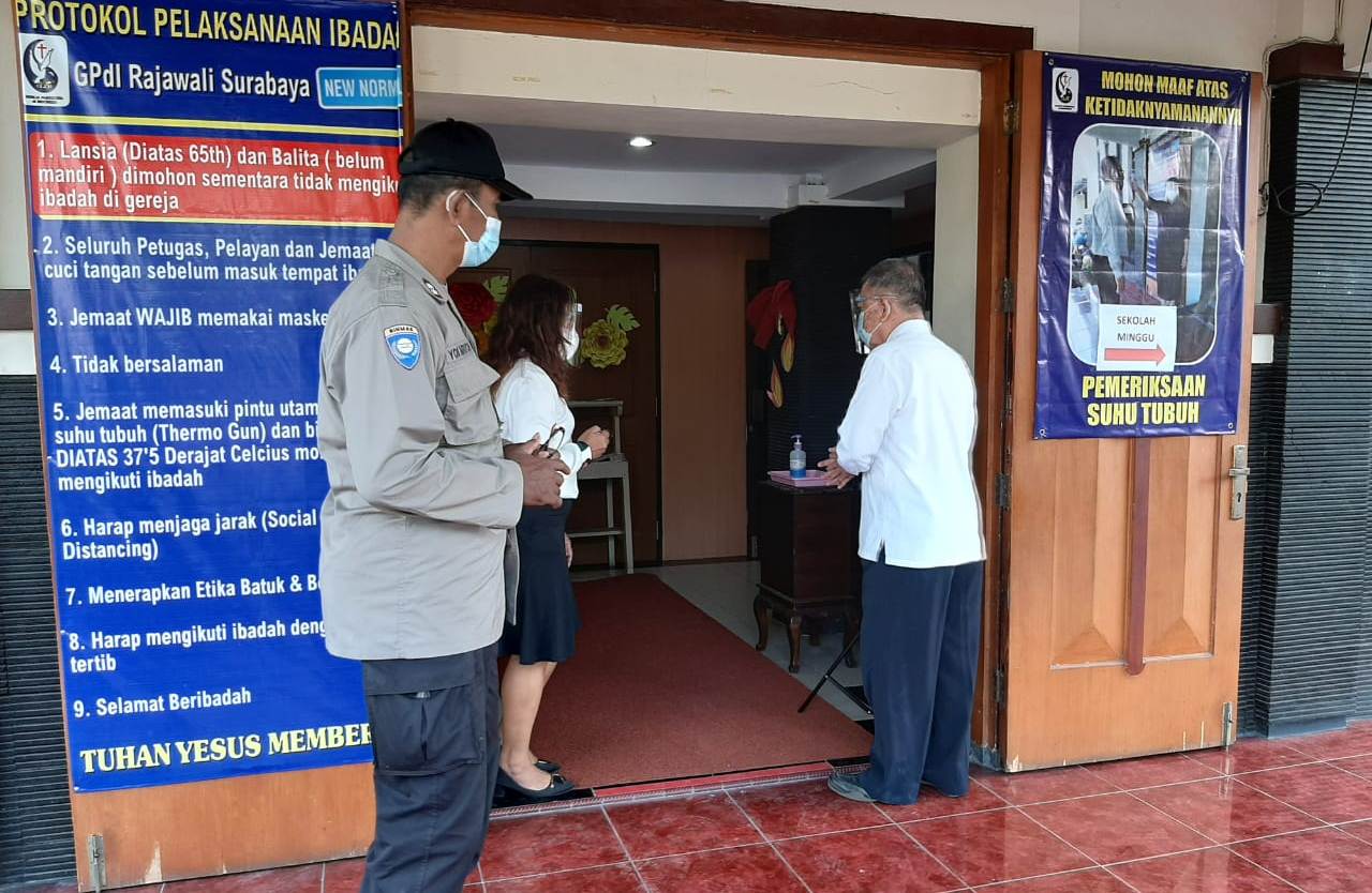 Seputarperak.com- Pengamanan kebaktian dilakukan Aiptu Marijono, Babinkamtibmas Perak Timur, Polsek Pabean Cantikan, Polres Pelabuhan Tanjung Perak di Gereja Pantekosta, Jalan Rajawali, Minggu pagi, 6 Juni 2021.