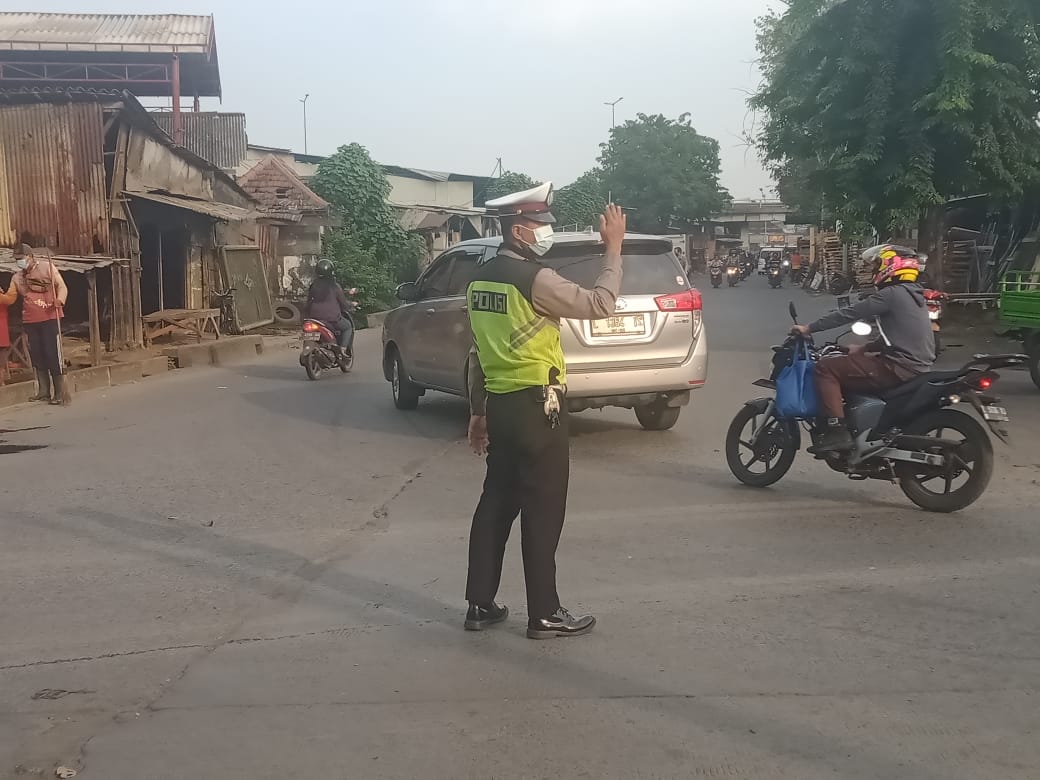 Seputarperak.com- Pengaturan lalu lintas pagi dilakukan personil Unit Lantas Polsek Asemrowo, Polres Pelabuhan Tanjung Perak di Jalan Tambak Mayor, Sabtu, 12 Juni 2021.